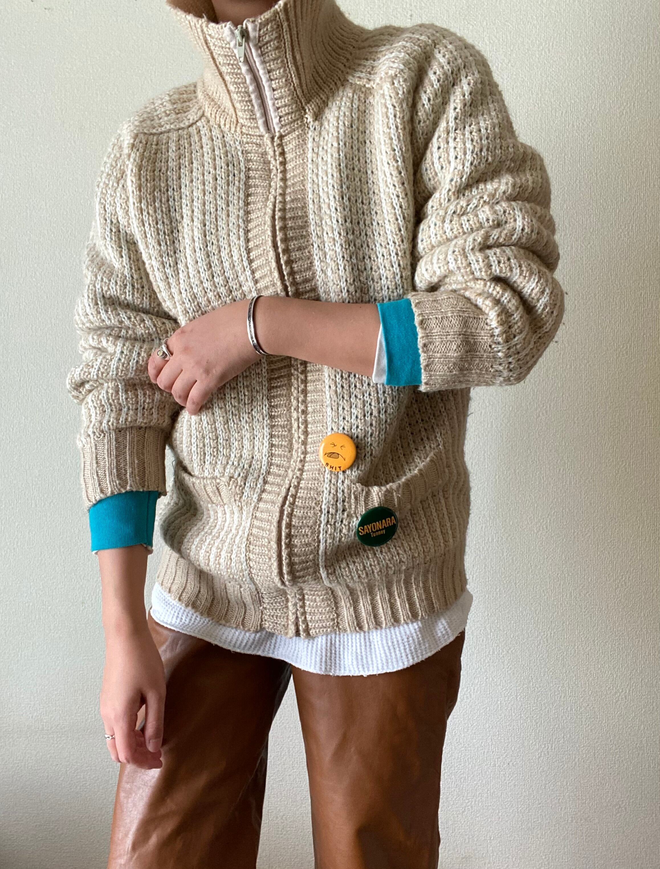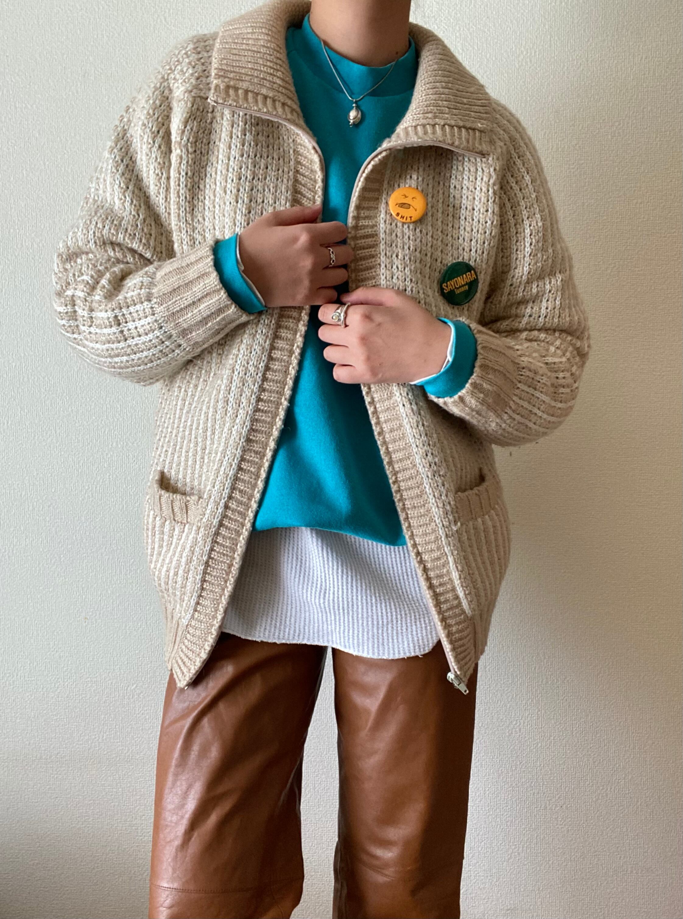 どんなスタイリングにも馴染んでくれる万能なベージュカラーのジップアップカーディガン。