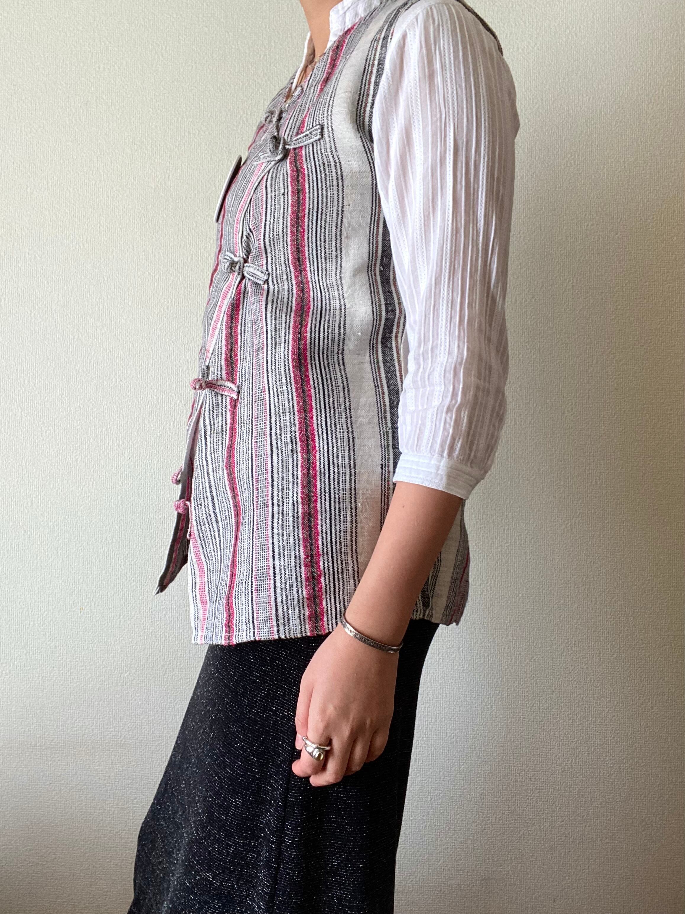 チャイナボタンとストライプ柄がアクセントになったリネンベスト◎
