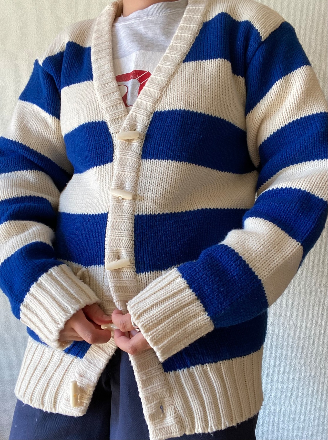 オフホワイトにブルーのボーダーパターンがマリンぽい雰囲気があるアクリルカーディガン。