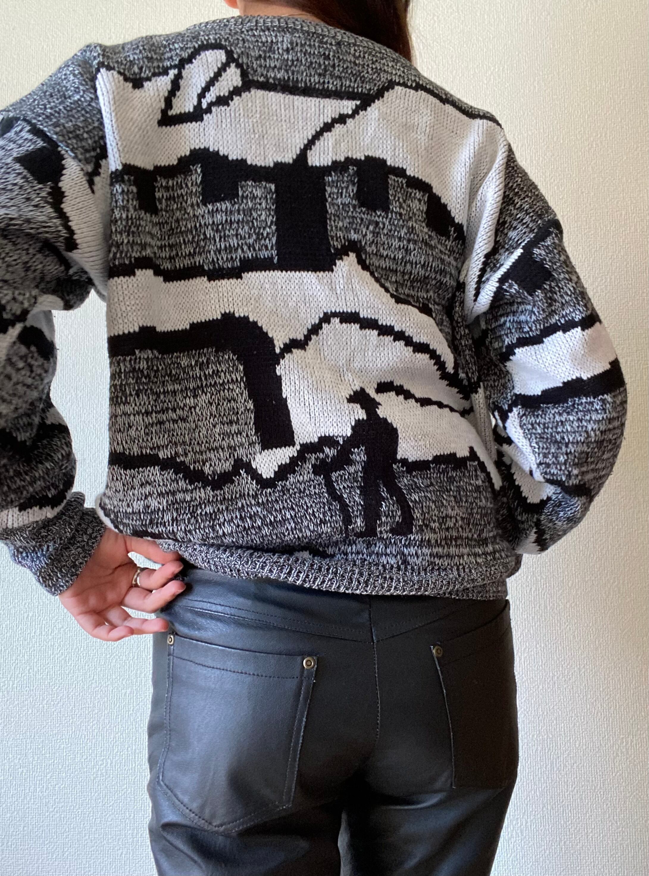 人のシルエットが編み込まれた珍しい柄のセーター。