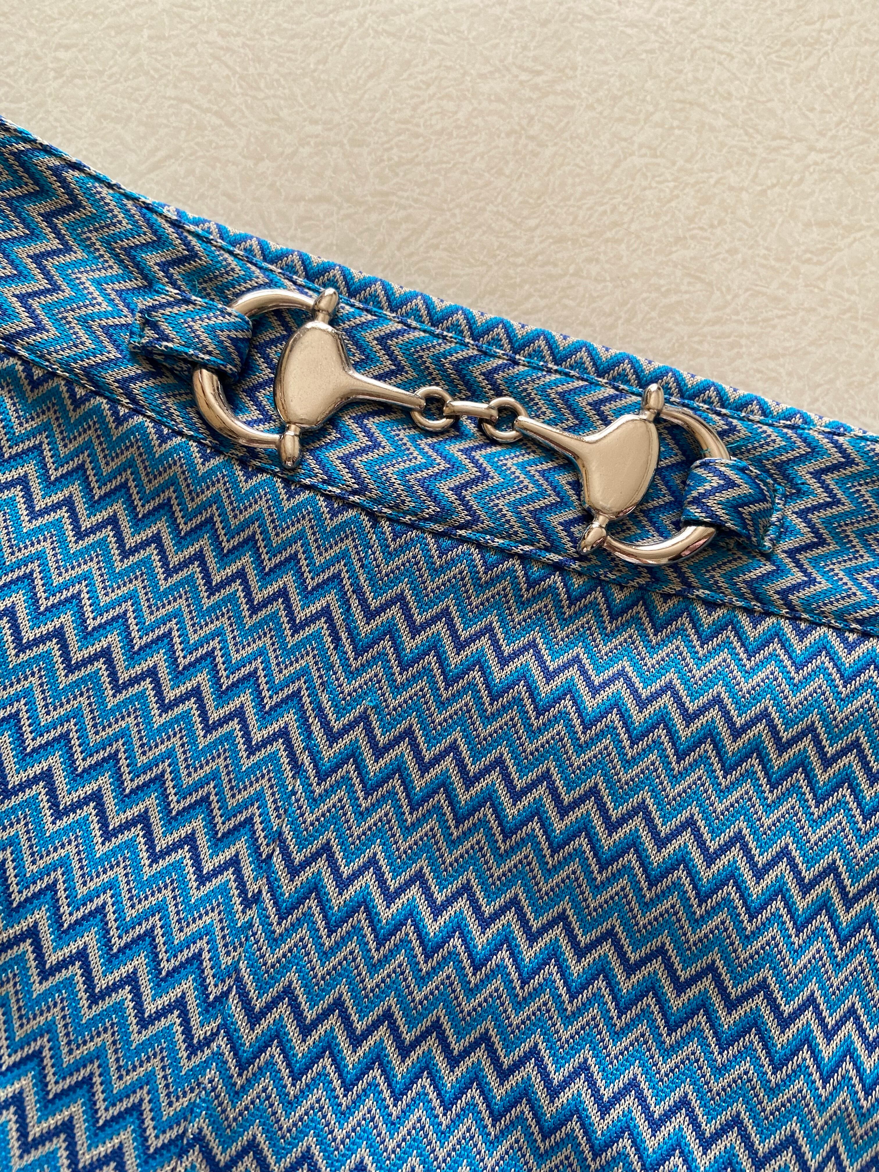 サイケデリックな幾何学模様が目を惹くアクリルパンツ。ウエスト部分の金具がワンポイントになっておりかっこいいです◎